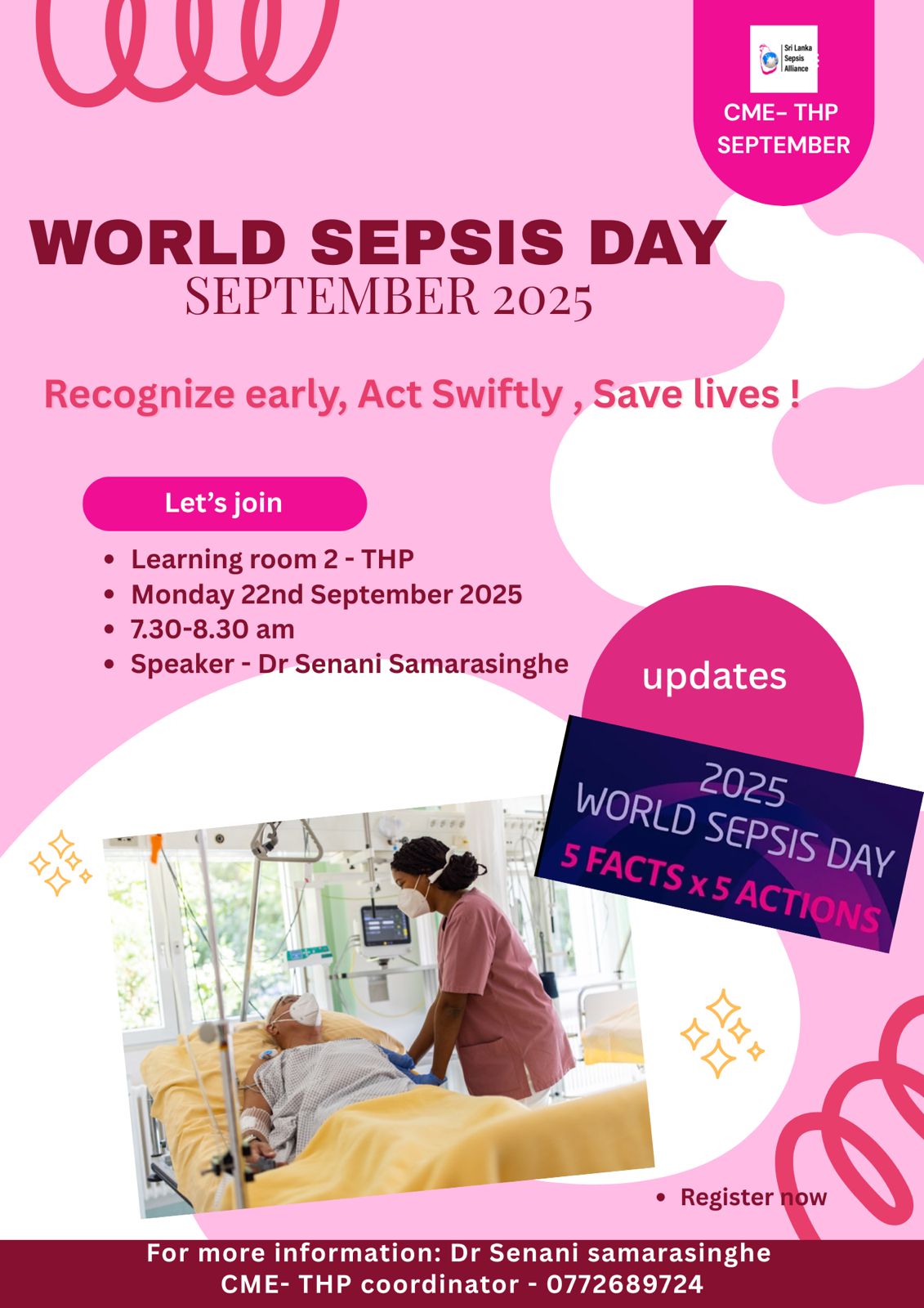 On 13th September, the Department of Anaesthesiology and Critical Care at Teaching Hospital Peradeniya successfully organized World Sepsis Day activities. An awareness lecture was conducted for doctors at both THP and the Dental Hospital, emphasizing early recognition and management of sepsis. The program highlighted the key message of the Global Sepsis Alliance, stressing that sepsis is preventable and treatable with timely action. The event drew active participation, fostering meaningful discussions and renewed commitment to sepsis awareness. Overall, the initiative was a massive success, uniting healthcare professionals in the fight against sepsis.