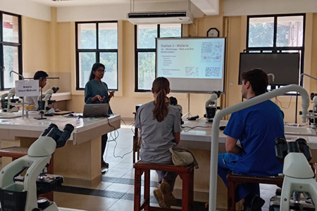 The session focused on key parasitic diseases encountered in tropical regions, including malaria, leishmaniasis, filariasis, and toxoplasmosis. Students participated in interactive discussions and microscopy sessions, providing practical exposure to diagnostic parasitology.