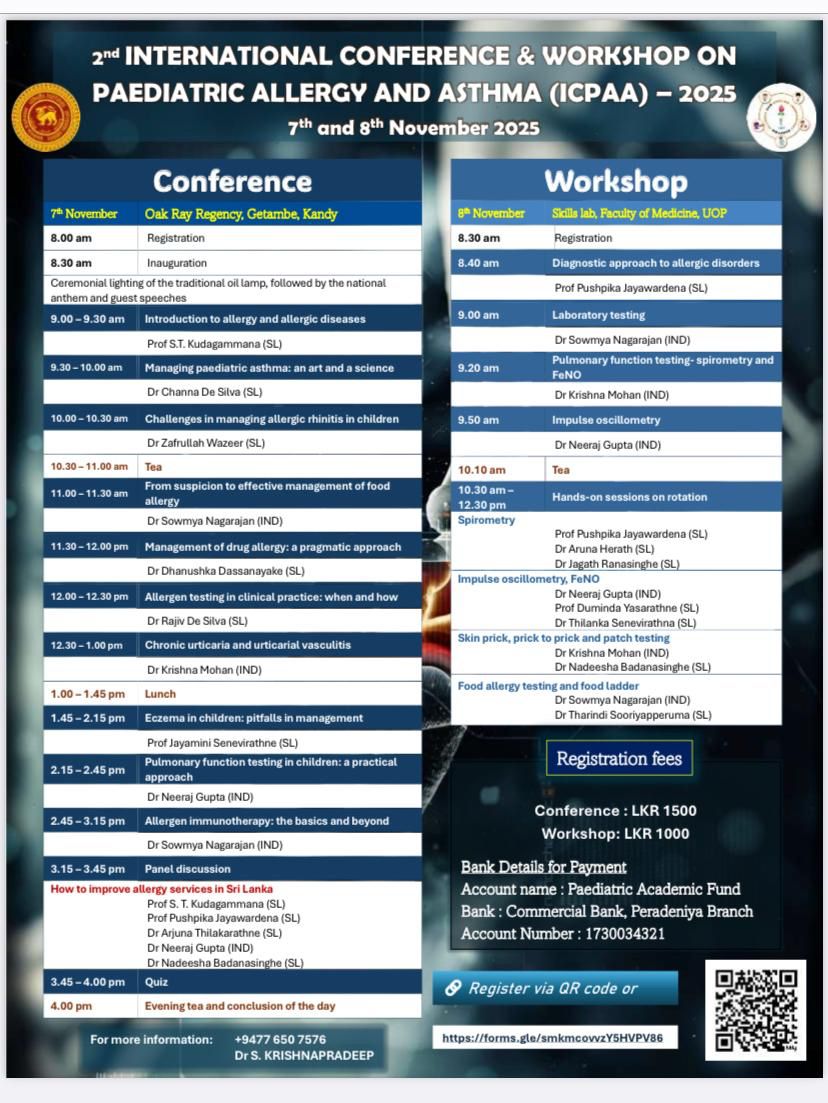 The Department of Paediatrics, Faculty of Medicine, University of Peradeniya, in collaboration with the Indian Academy of Paediatrics (Allergy and Applied Immunology Chapter), is proud to host the International Conference and Workshop on Paediatric Allergy & Asthma on 7th and 8th November 2025.